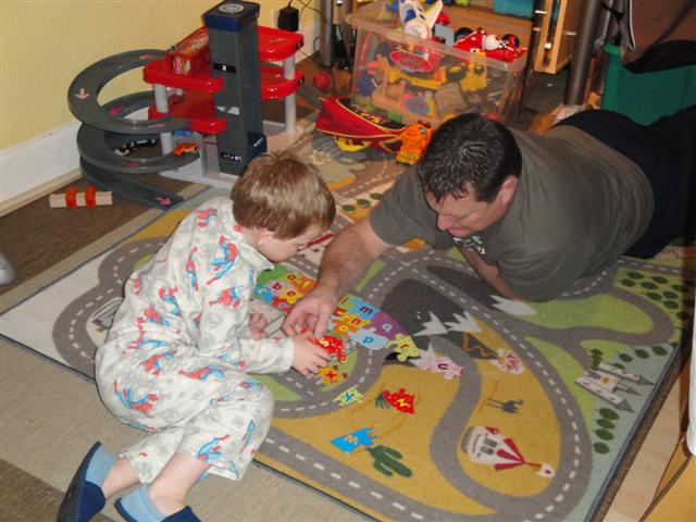 Daddy helping with my crocodile alphabet puzzle |