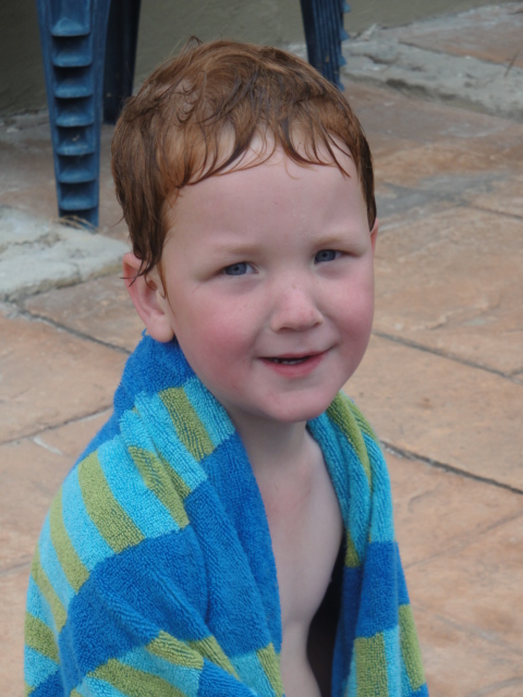 Warming up in the towel after the cold water of the slippy slide |