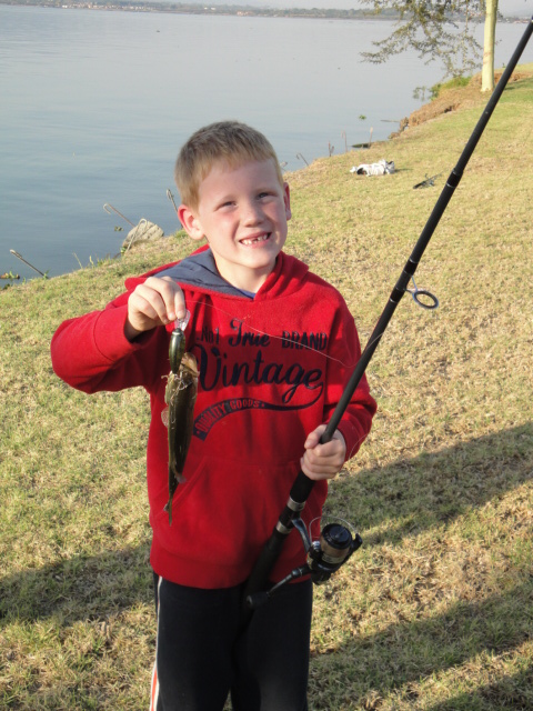 James' first fish.. cast, hooked and reeled in all on his own! (at Hartbeespoort Dam) |
