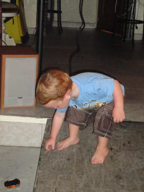 Jack racing his cars down the ramp |